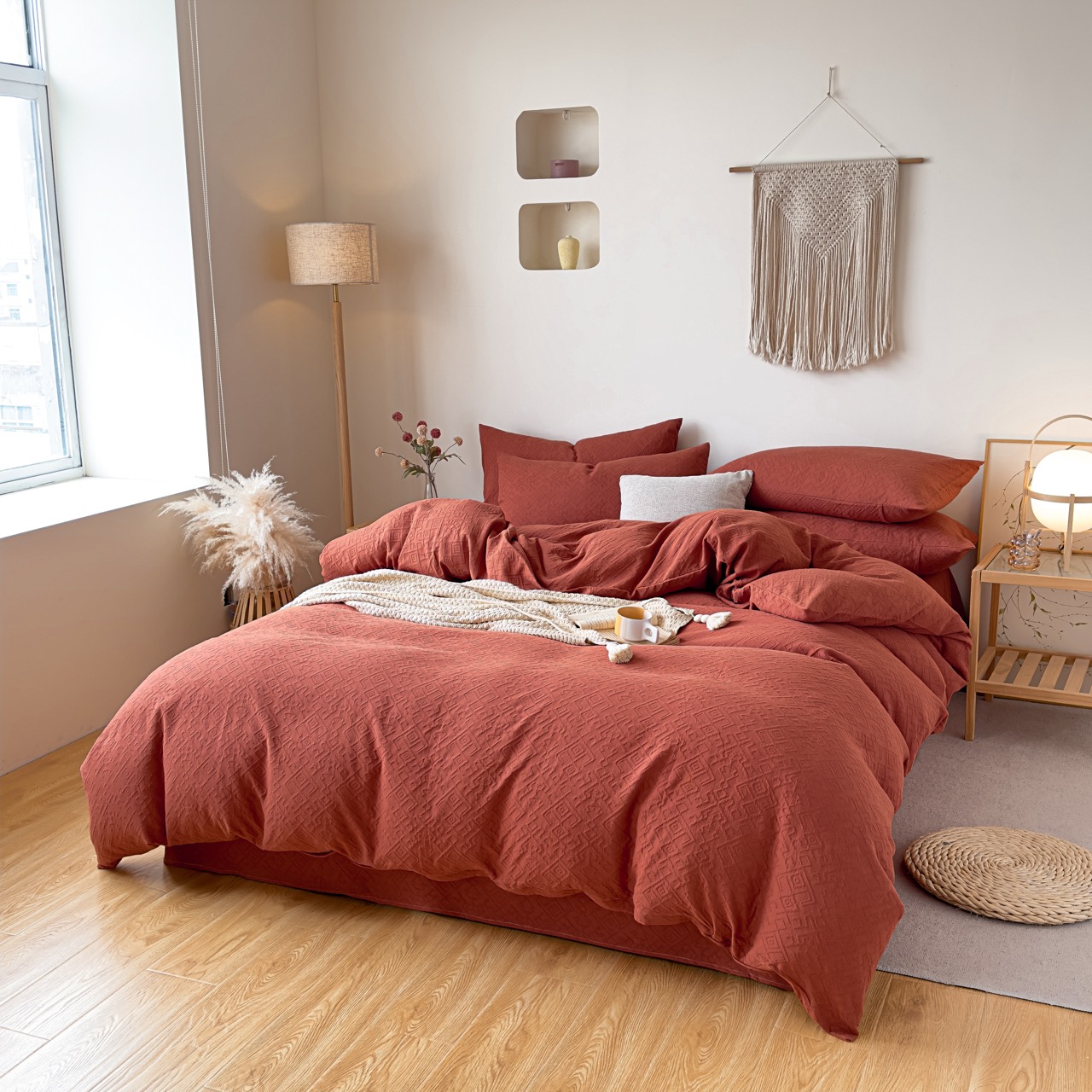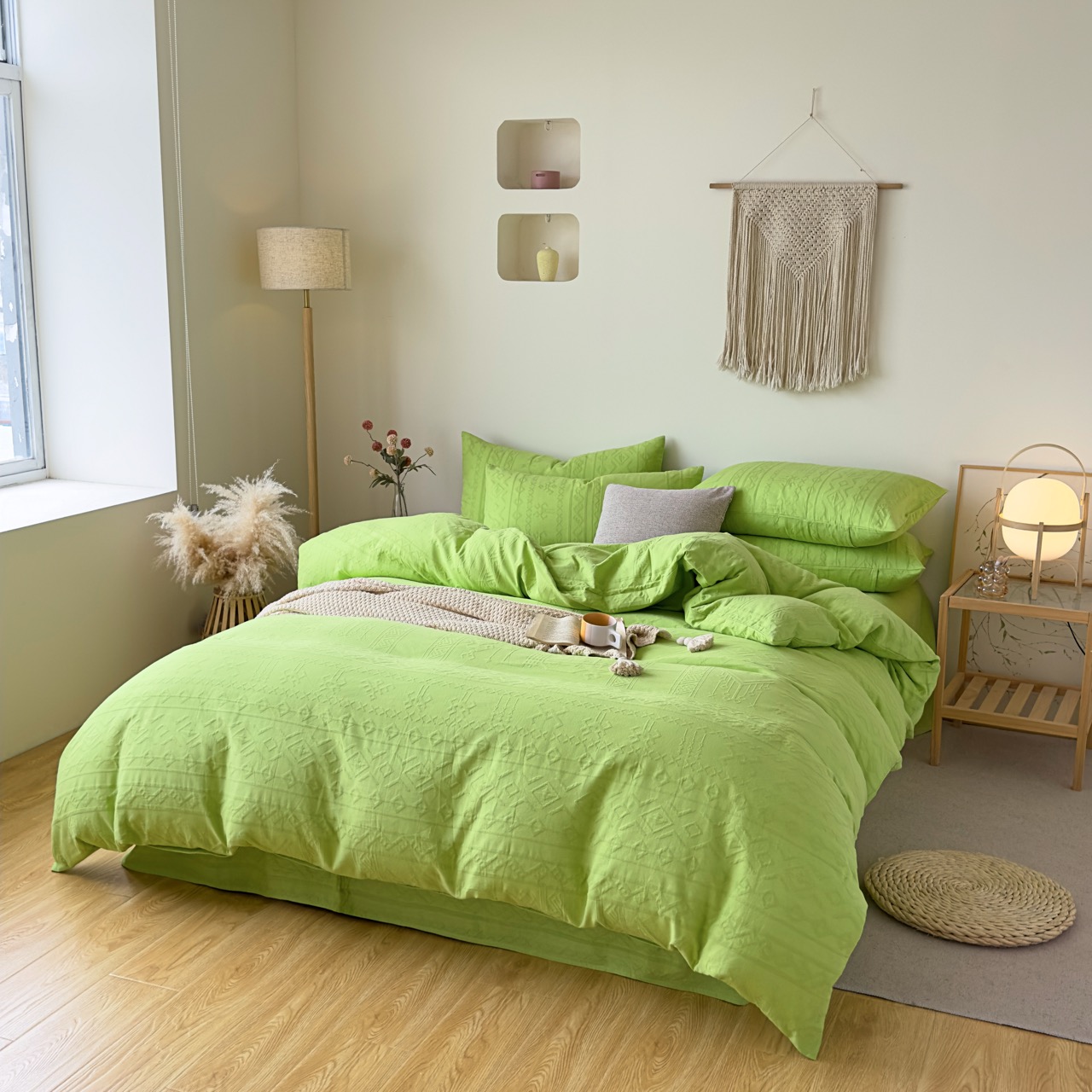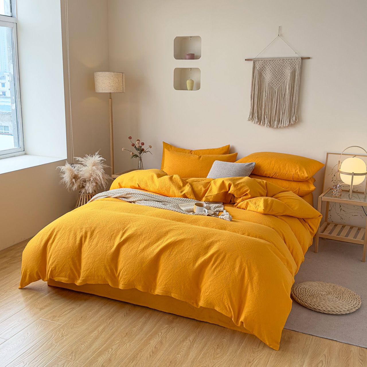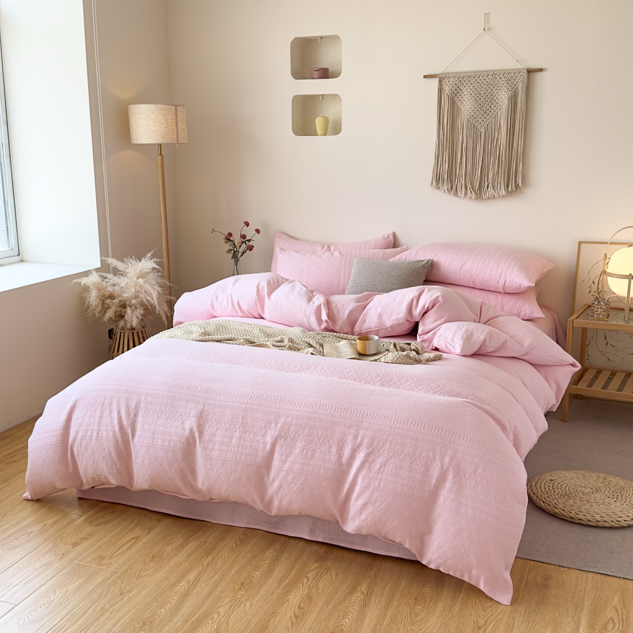 特别注意:纯棉床品易皱,洗后可轻微抻平再晾晒(减少后续熨烫需求),若需熨烫,待面料半干时用中温熨烫(温度 110-130℃,避免高温烫坏面料);无需频繁使用柔顺剂(会堵塞纯棉纤维孔隙,降低吸汗透气性);若床品有刺绣、蕾丝装饰,洗时需翻面并放入洗衣袋(防止装饰勾坏、脱落)。