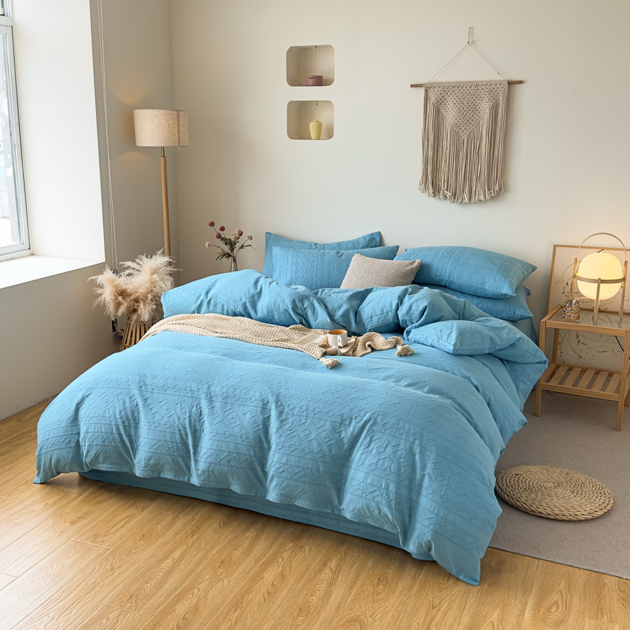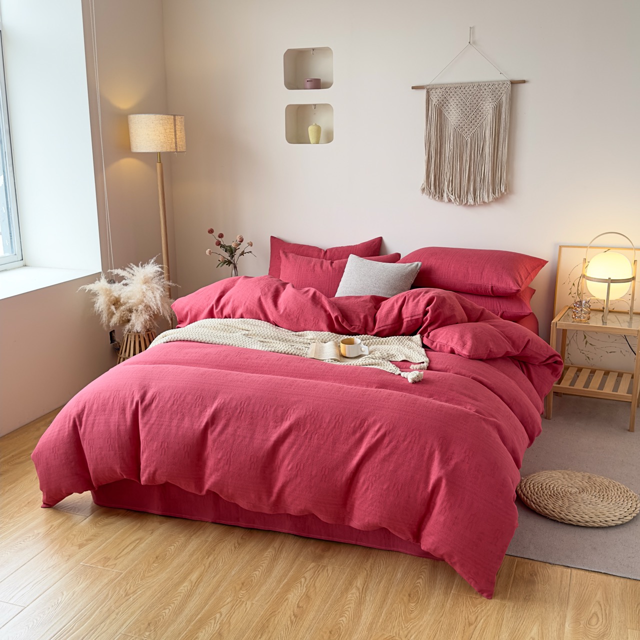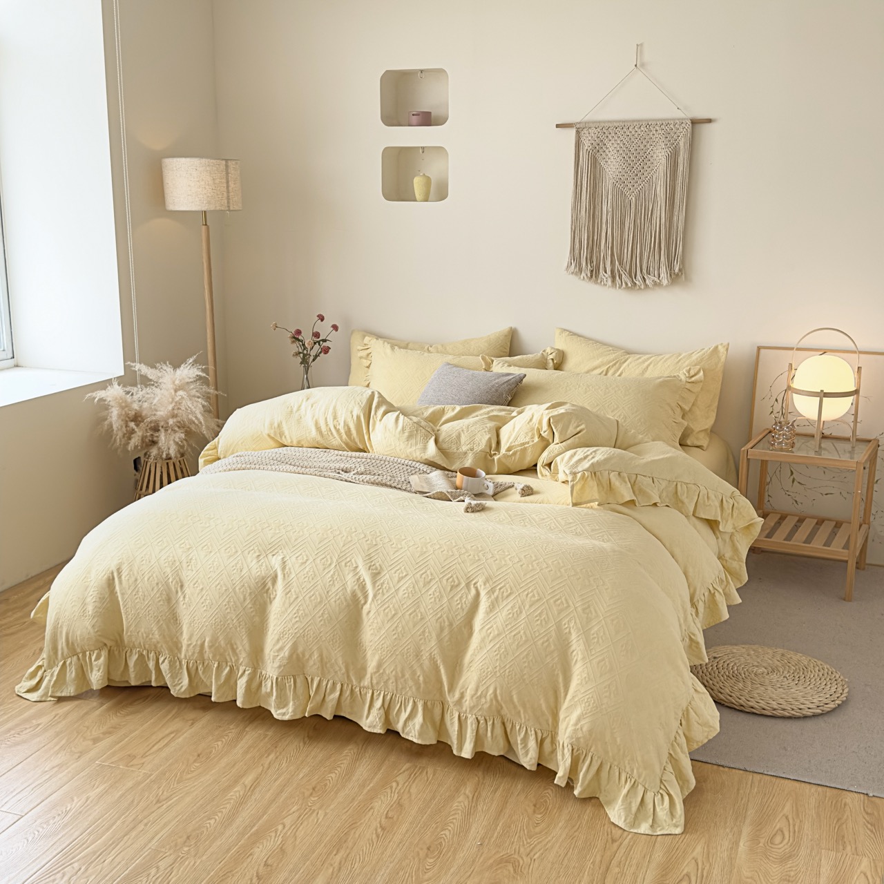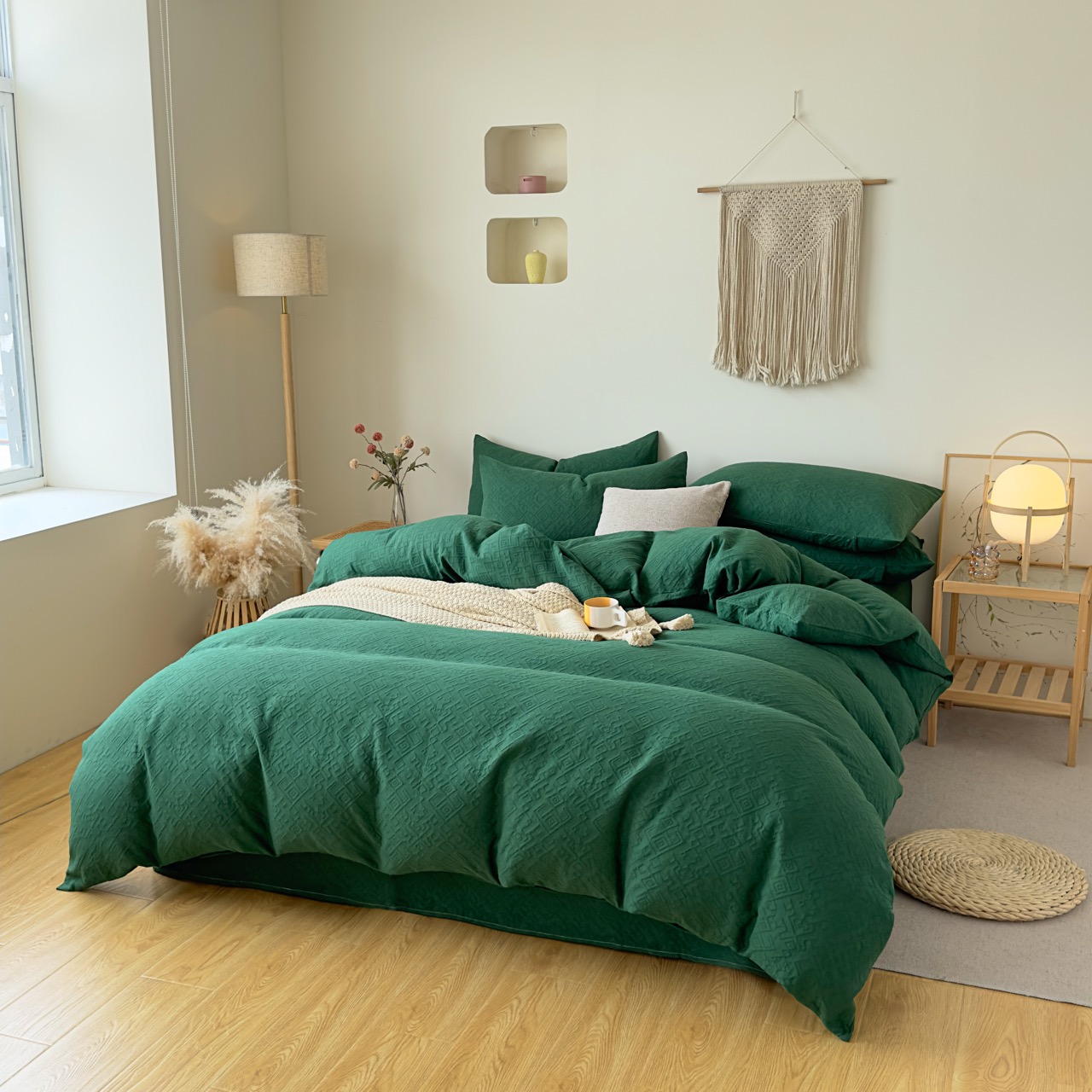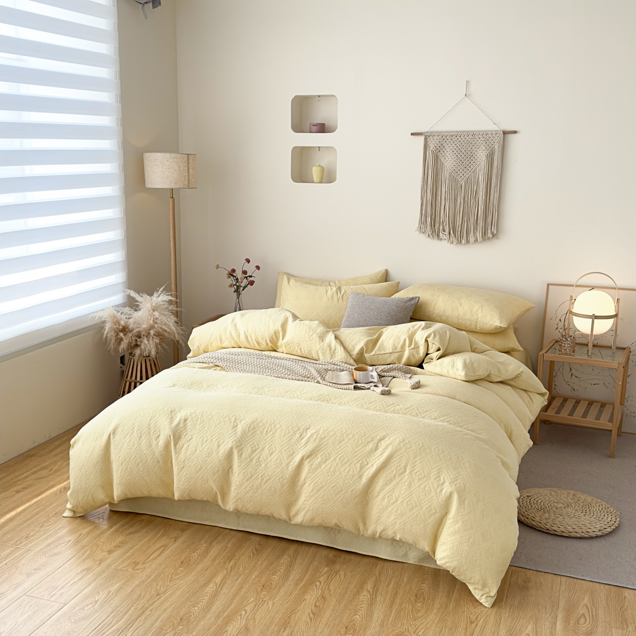 特别注意:纯棉床品易皱,洗后可轻微抻平再晾晒(减少后续熨烫需求),若需熨烫,待面料半干时用中温熨烫(温度 110-130℃,避免高温烫坏面料);无需频繁使用柔顺剂(会堵塞纯棉纤维孔隙,降低吸汗透气性);若床品有刺绣、蕾丝装饰,洗时需翻面并放入洗衣袋(防止装饰勾坏、脱落)。